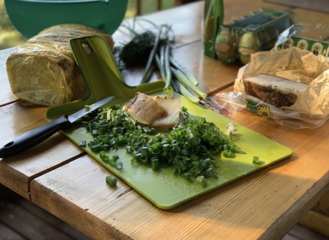 Nakvynė sodyboje arba stovyklavietėje, pavėsinės, kepsninės, pirtis ant upės kranto.